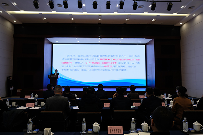 當天,白清元一行來到甌海農商銀行總部,聽取電子營業執照在銀行領域應用情況介紹。近年來,溫州市市場監督管理局和甌海農商銀行率全國之先共同探索電子營業執照在銀行領域的應用,擦亮“開戶零次跑、放款半小時”金名片,以“市監+金融”的創新實踐破解市場主體純信用貸款融資難、融資貴、手續繁等問題。目前,該項應用已實現溫州縣域全覆蓋。白清元指出,要繼續深化探索,進一步拓寬應用場景,提升服務質效,將這張“金名片”擦得更亮,把這項惠企利民的好事辦得更好、更實。